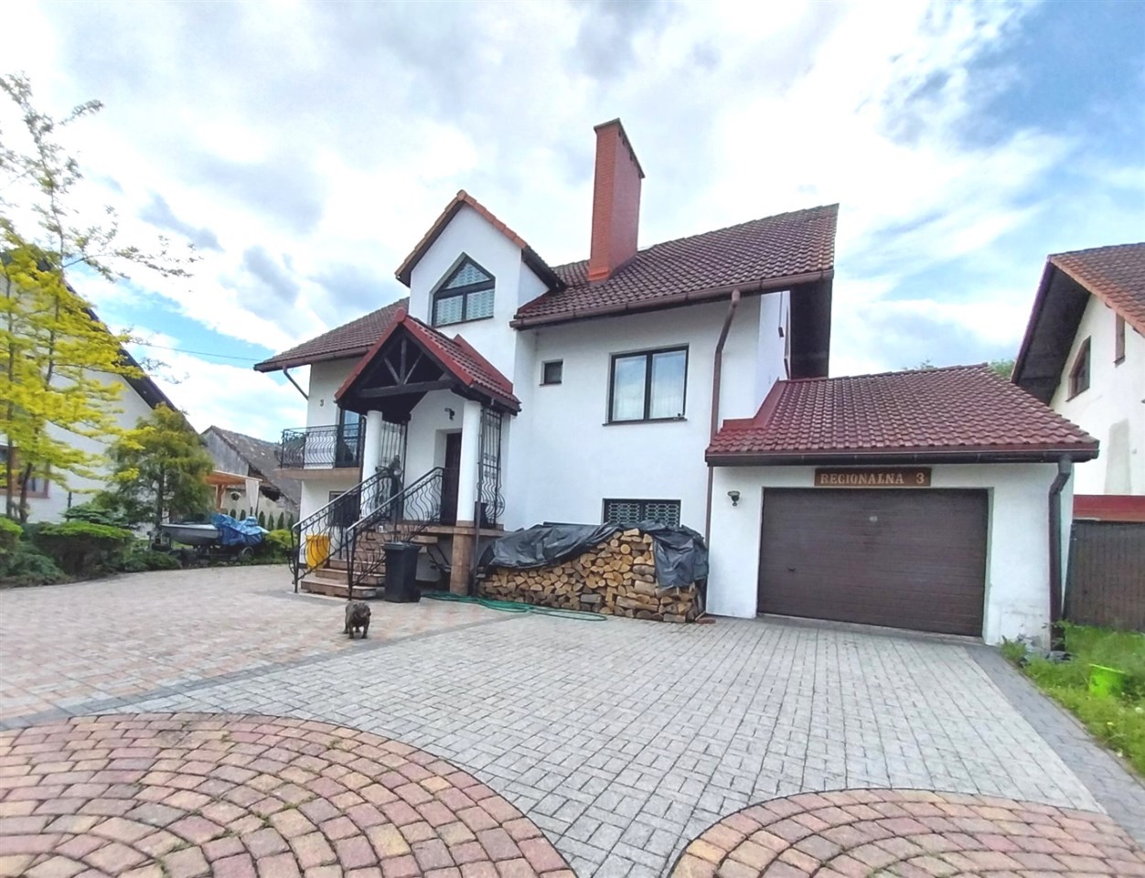Urokliwa i uporządkowana przestrzeń wokół domu; duży, elegancki podjazd i stylowe schody wejściowe.