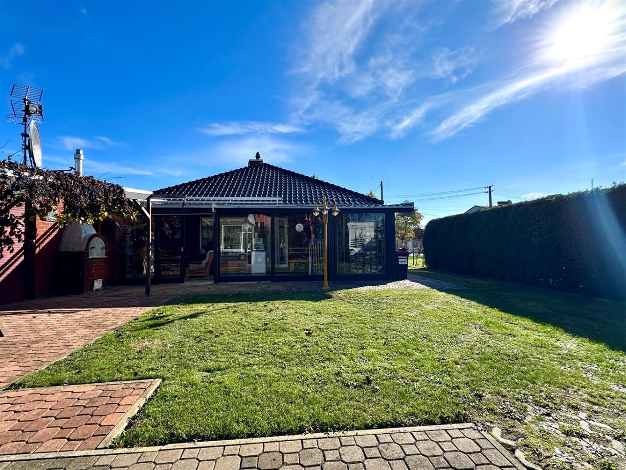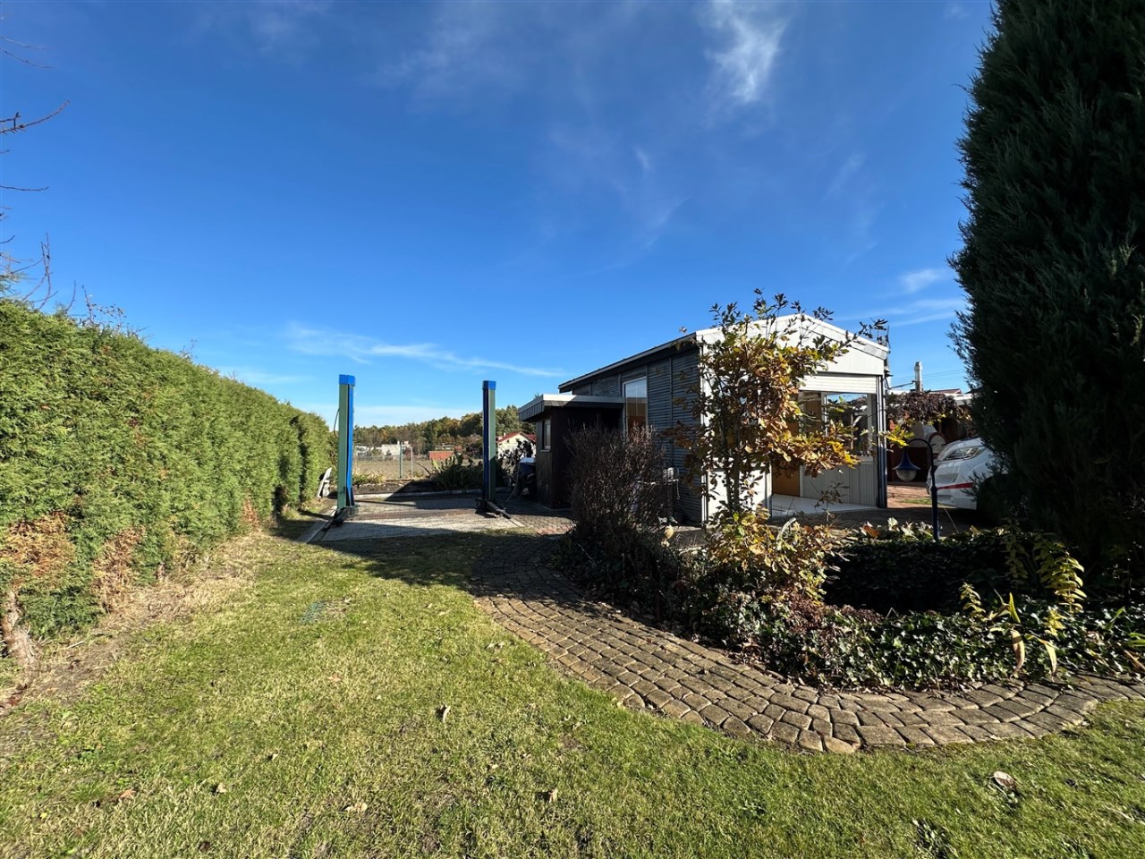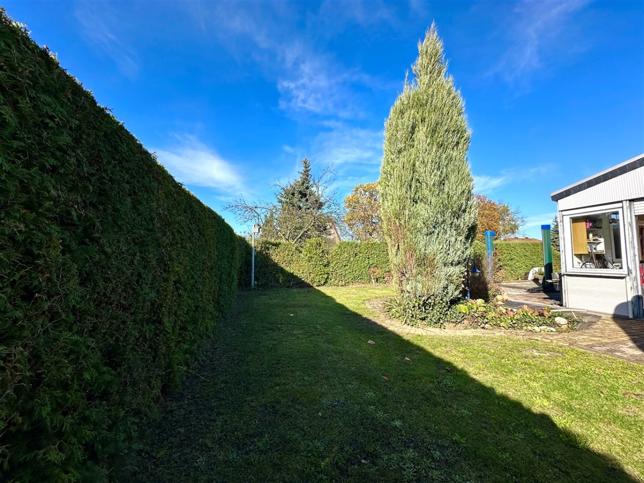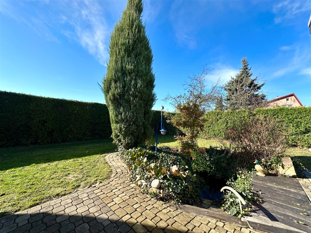 Ogród zagospodarowany, otoczony bujnym, starannie utrzymanym żywopłotem, który zapewnia mieszkańcom poczucie prywatności.