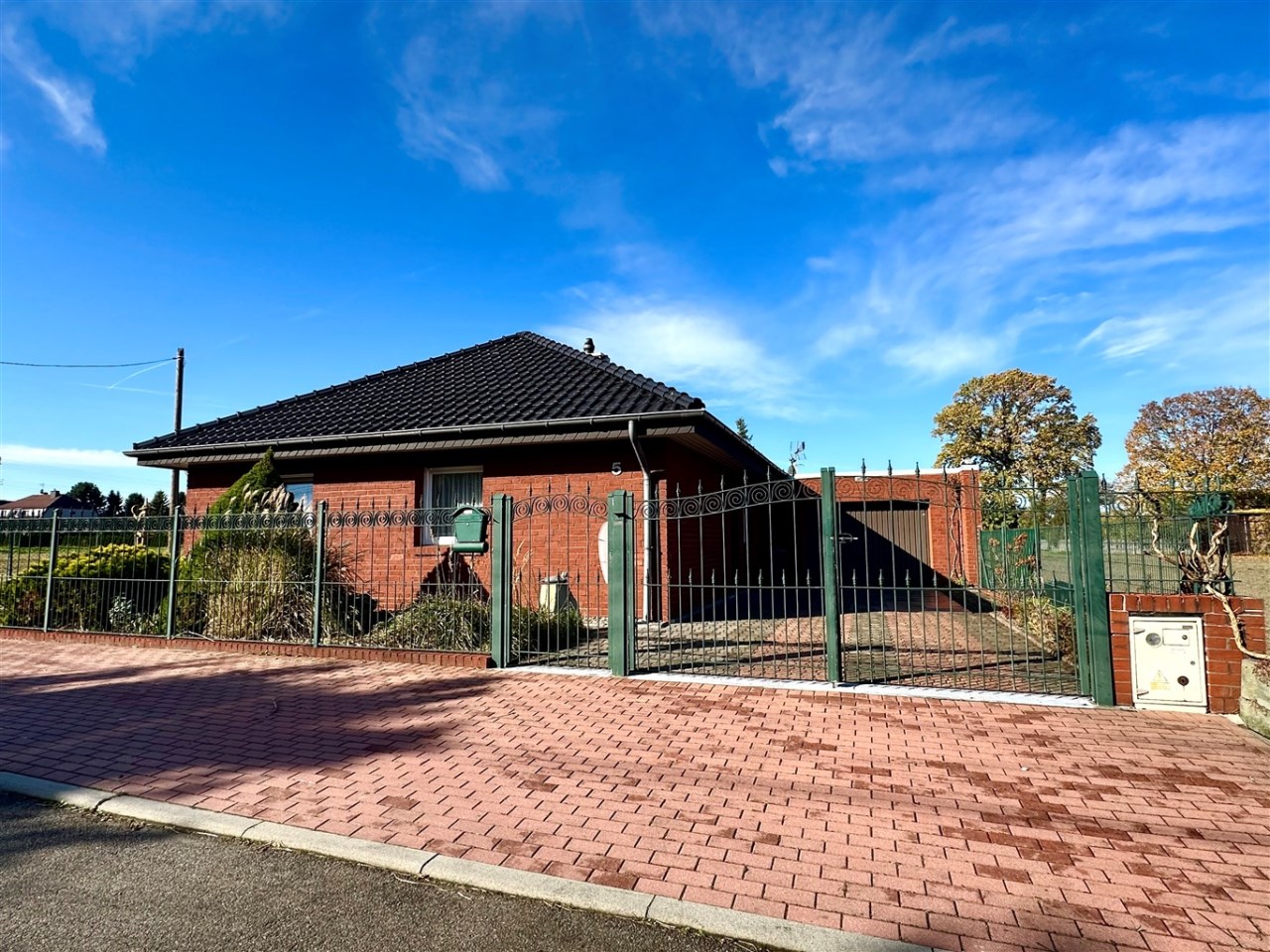 Płaska działka o powierzchni 724m2 o regularnym kształcie prostokąta ogrodzona ozdobnym płotem ocynkowanym, podjazd wyłożony kostką.